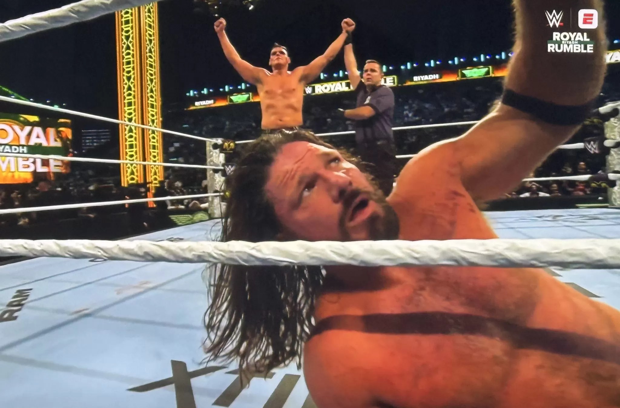Back in the ring Styles connected with a powerbomb on The Ring General, but Gunther kicked out at two. AJ went to the apron and hit a springboard 450 then connected with the Styles Clash and Gunther somehow managed to kick out.