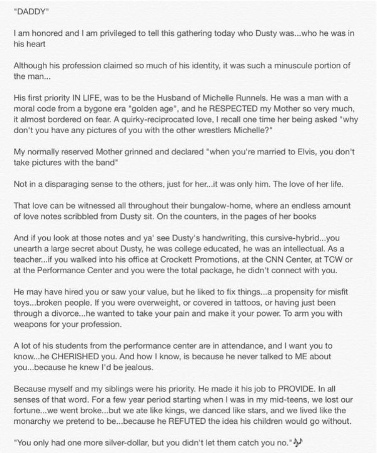The wrestling world truly lost a legend when Dusty passed away, but his legacy will live on forever. You can read the eulogy that Cody posted below.