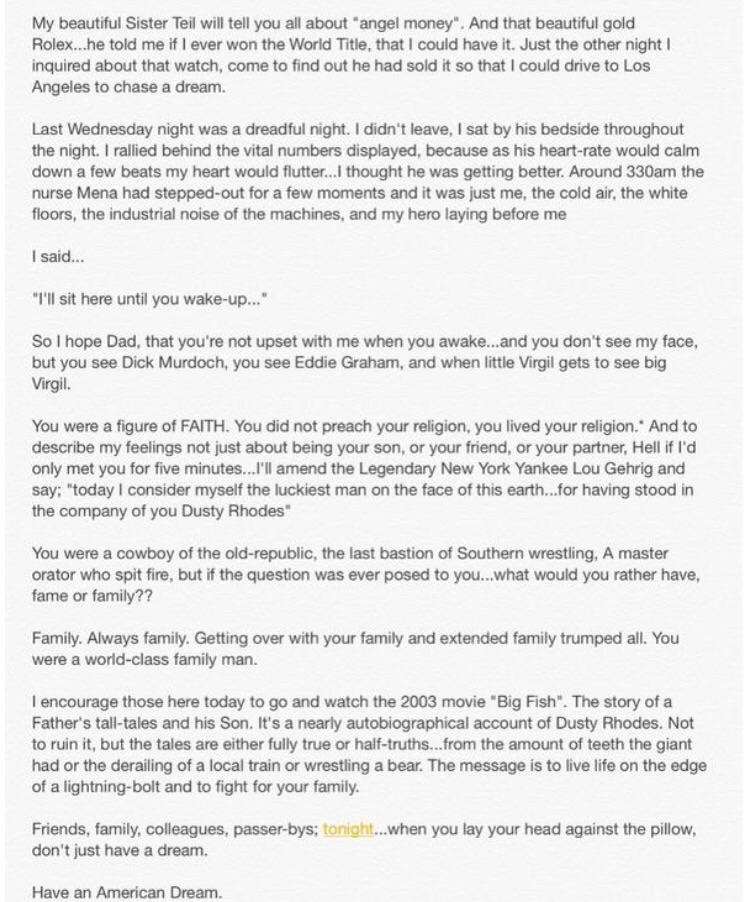 Cody Rhodes posted the eulogy for his father Dusty Rhodes on his Twitter account earlier and it’s quite the beautiful speech.