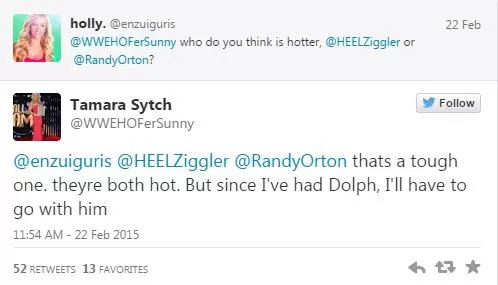Sunny was answering fan questions on Twitter earlier when a fan asked her who she thought was hotter, Orton or Ziggler. Sunny then went with Ziggler on the grounds that she’s “had” him. The tweet has seemingly been deleted by Sunny and the person who asked the question. You can check out a screenshot below, a tweet where the original post seems to acknowledge that they’re deleting the tweet and a funny tweet from the always hilarious @momsagainstwwe.