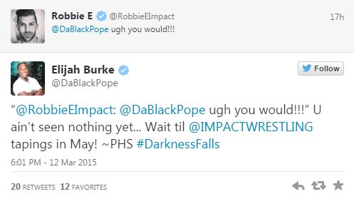 News It Looks Like ‘The Pope’ D’Angelo Dinero Is Returning To TNA By Still Real To Us - Mar 13, 2015 0 FacebookTwitterPinterestWhatsApp Former WWE and TNA star “The Pope” D’Angelo Dinero (Elijah Burke) is apparently returning to TNA at the May Impact Wrestling tapings in Orlando. He had this exchange with Robbie E on Twitter this week: