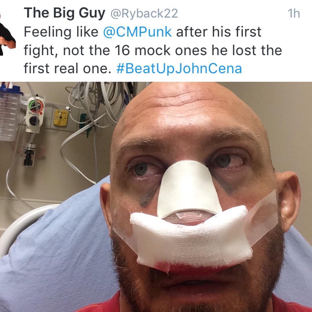 It’s really no secret that the Big Guy Ryback and CM Punk aren’t going to be having any sleep overs anytime soon but Ryback took another step toward cementing they will never be cordial either. The Big Guy took to Twitter after having surgery performed on his nose and left us with this troll gold…