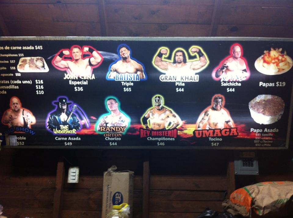 The restaurant may be named after John Cena, but the menu also advertises items named after The Undertaker, Kane, Batista, Randy Orton, The Great Khali and more. Check it out below.